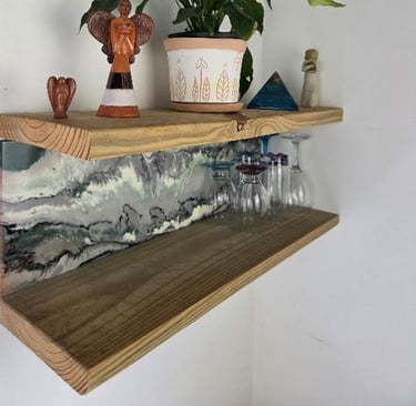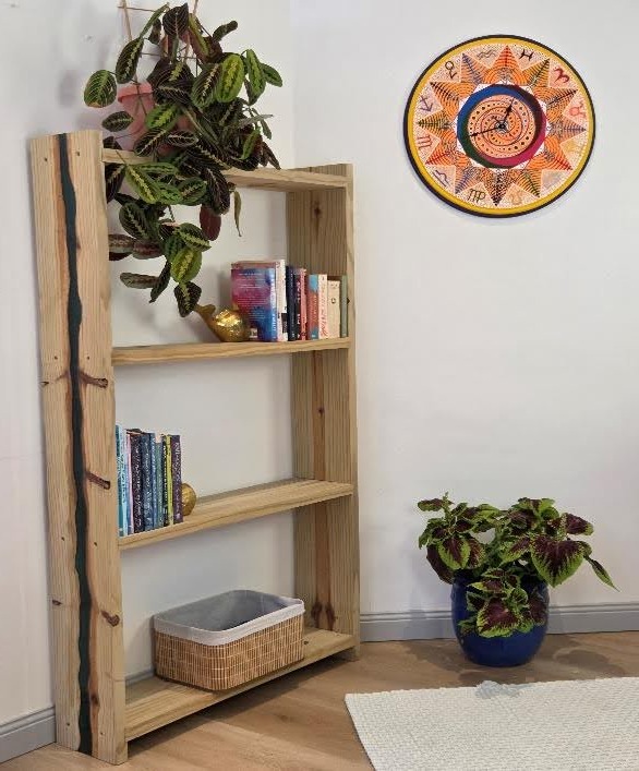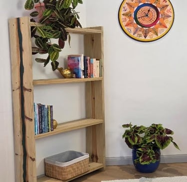Where function and art flow together; this artisan-crafted bookshelf features a resin river design, blending natural wood with aqua blue resin in hygge harmony. Bespoke orders.
